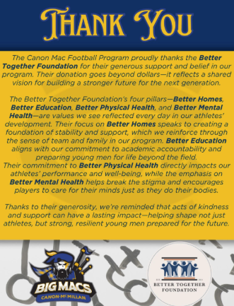 Better Together Foundation was proud to partner with Canon-Mac High School, located in the Pittsburgh suburb of Canonsburg, to support student-athletes for the 2025 football season. Through a recommendation from our board, we collaborated with Canon-Mac coaches to identify seven athletes from low-income families and provided them with new football cleats to ensure they are equipped for success on the field.