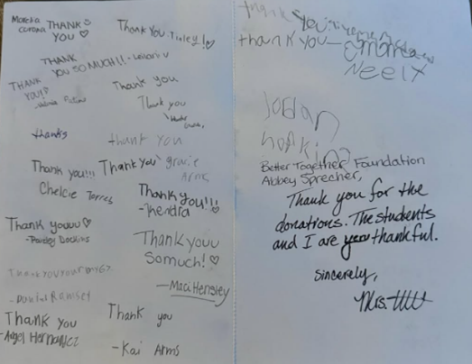 We were thrilled to receive handwritten thank-you notes from every student, expressing their gratitude for the supplies provided. This project reflects our commitment to supporting educators and creating opportunities for students to thrive through creativity and learning.